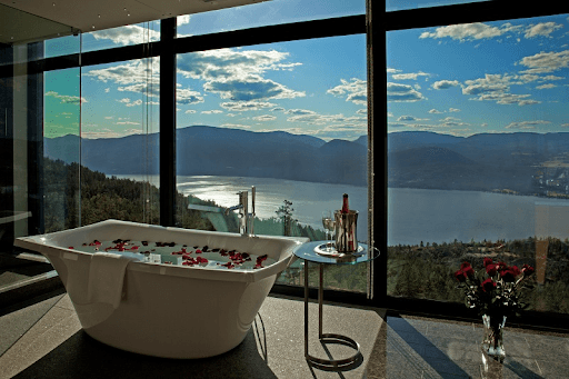 Panoramic Okanagan Lake and Monashee Mountain views. Enjoy a separate living area with bespoke furnishings and a cozy fireplace in the bedroom. Penthouse bathrooms feature a free-standing bath tub, dual granite sinks and also include a private sauna.